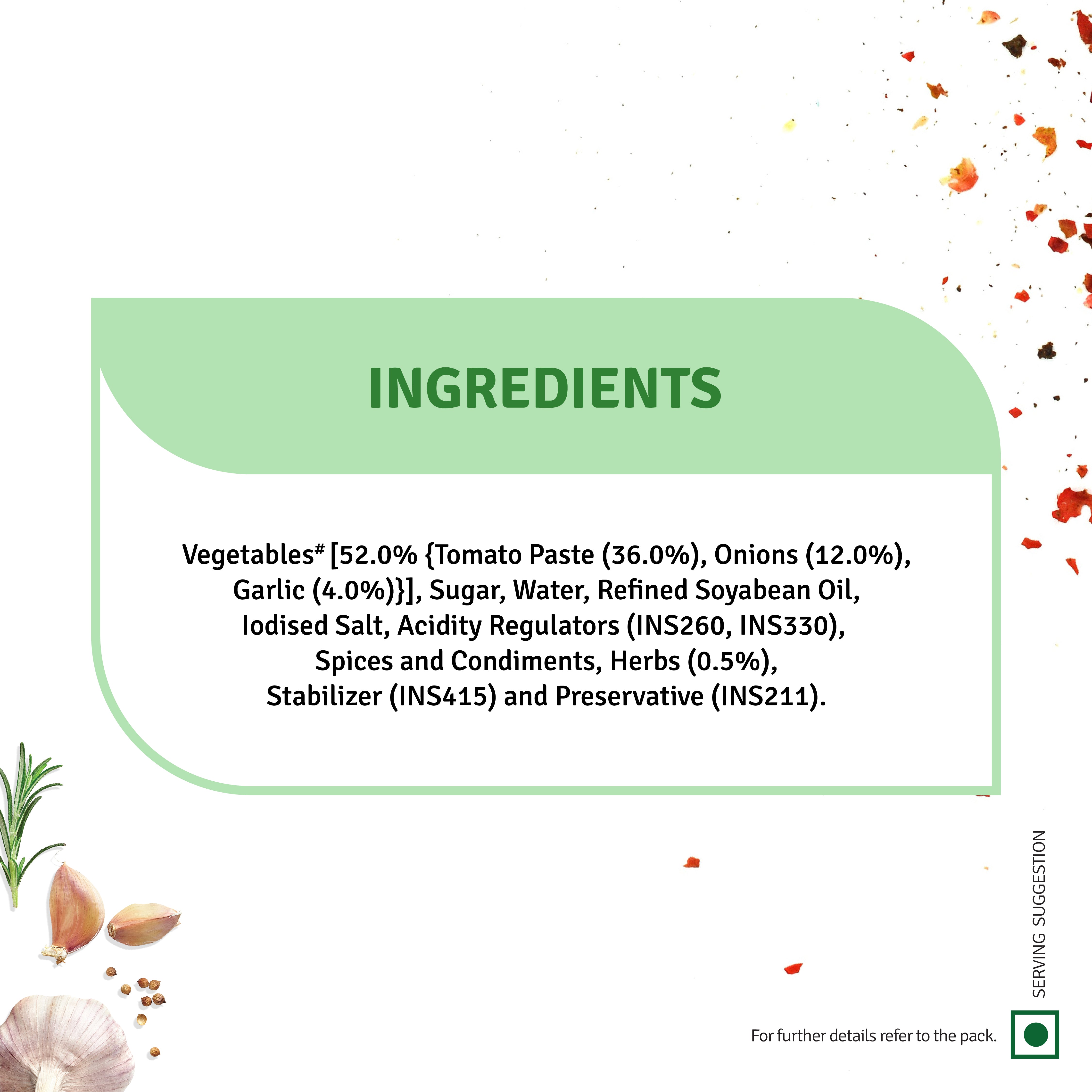 Made with the goodness of veggies, this herby tomato sauce is bursting with flavor! Seasoned with oregano and chili flakes, it makes pasta and pizza preparation really simple. Perfect as a base for 'red' pasta or a pizza spread, it’s balanced to suit the Indian palate, blending the right mix of tangy, savory, and spicy notes to elevate any Italian dish.